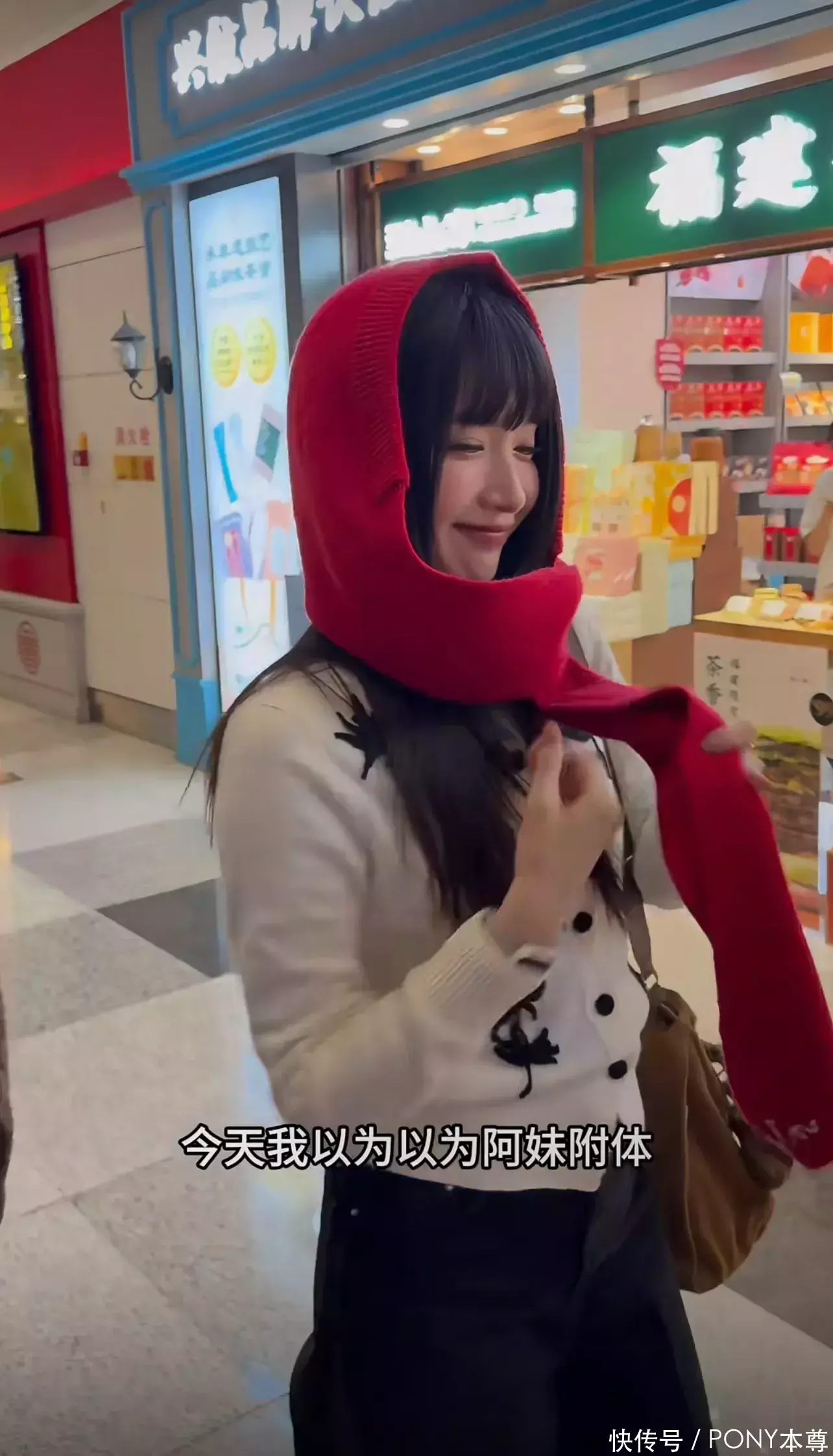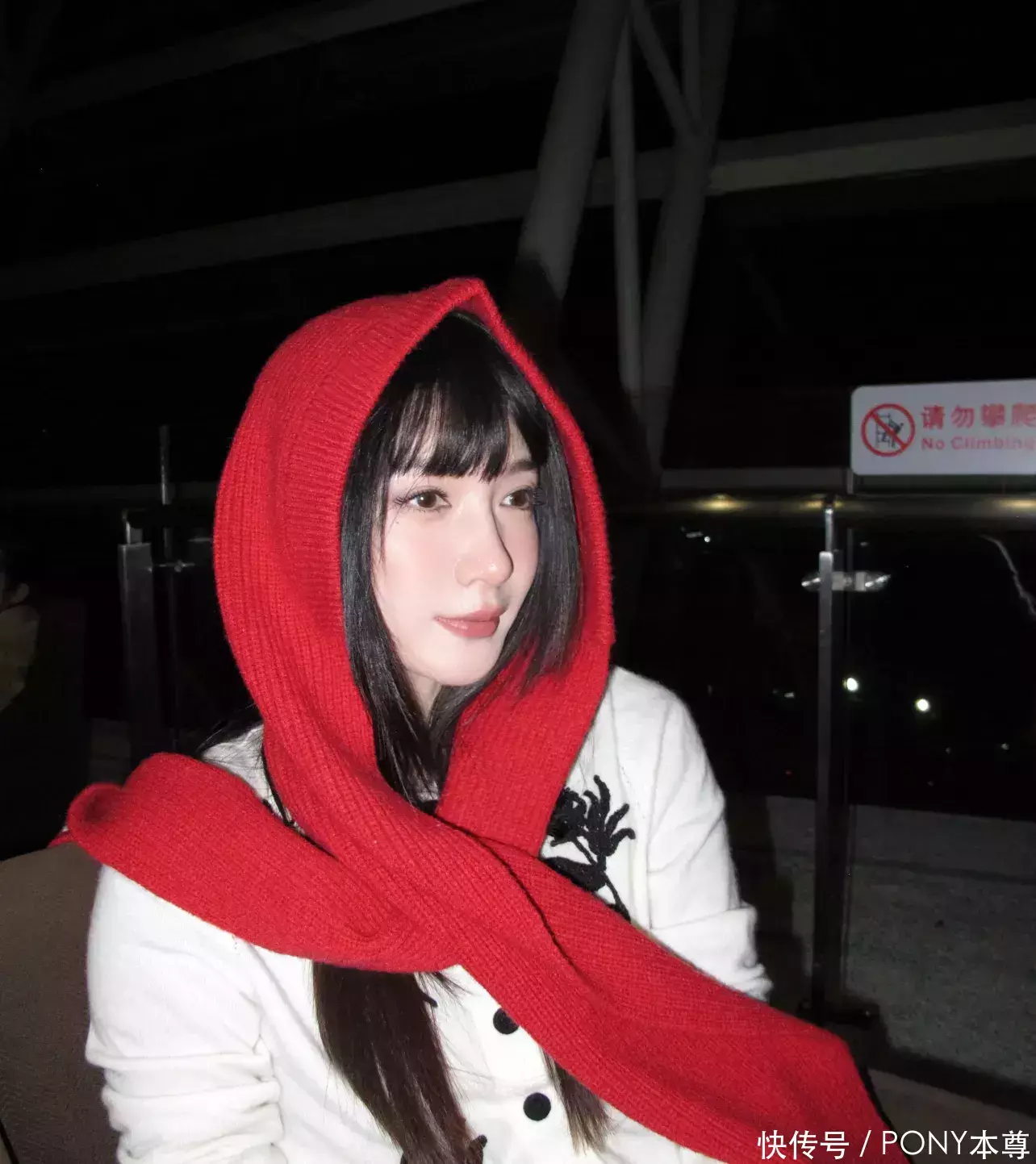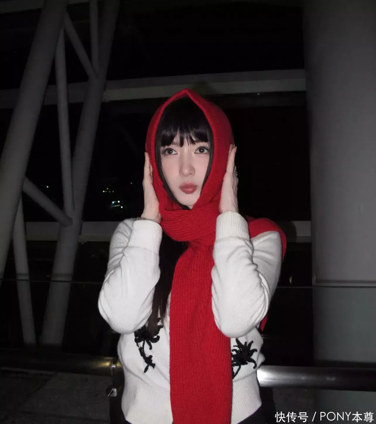 她身穿白色针织开衫,搭配黑色裤子,头戴红色针织围巾帽子,整个人看起来格外的温暖!