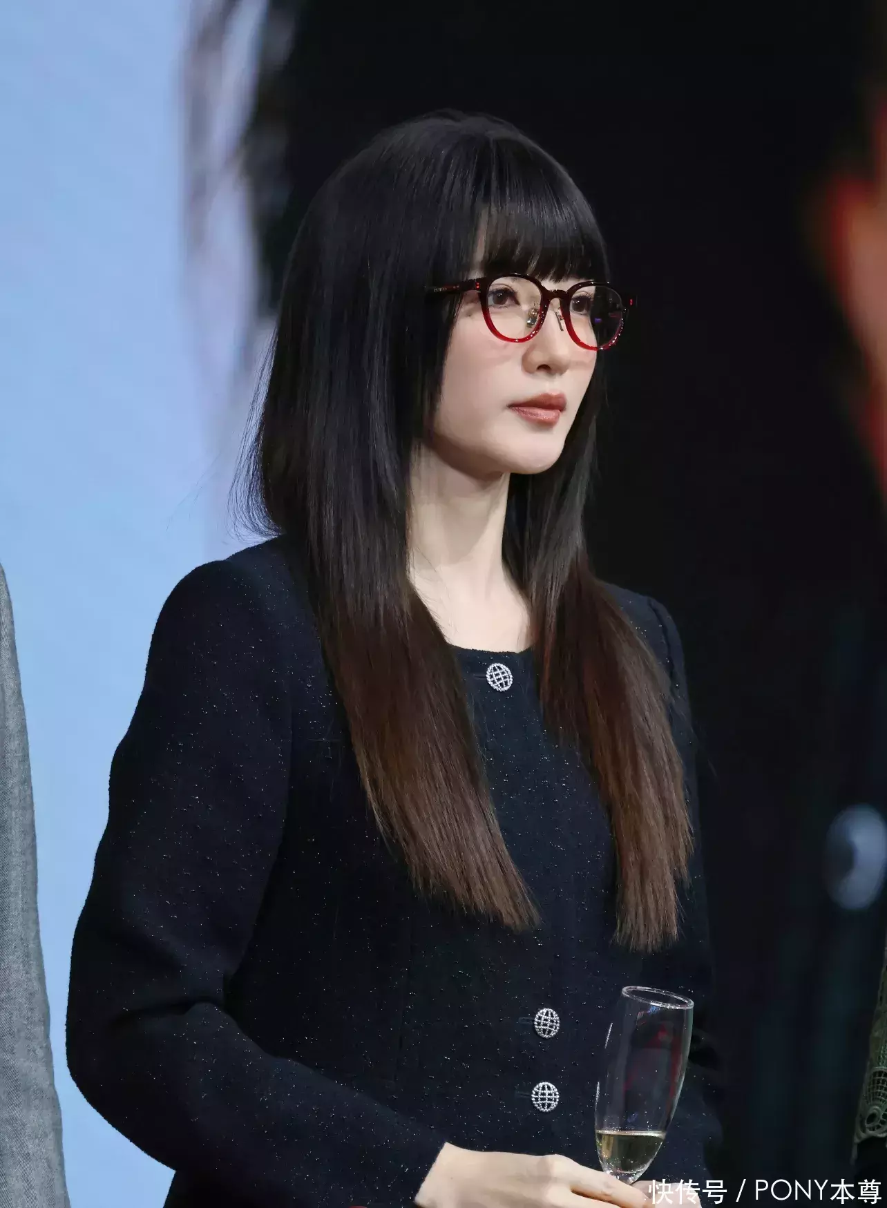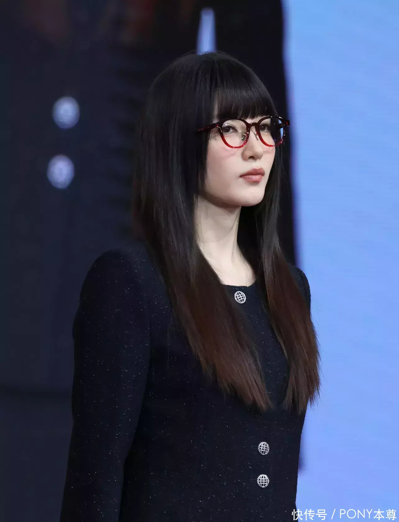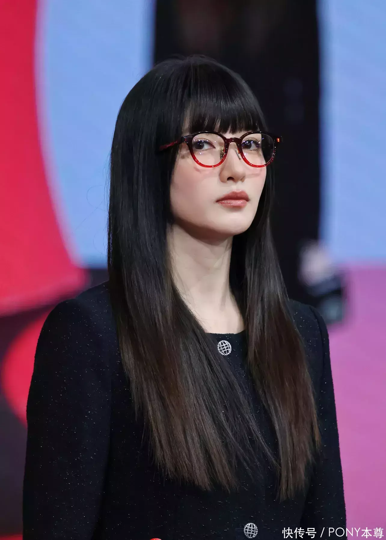齐刘海长直发造型和镜框眼睛简直是绝配!江疏影选择了一款撞色设计的眼镜,红黑色系搭配,让造型亮点几种的面部,仿佛是麻辣女教师附身!