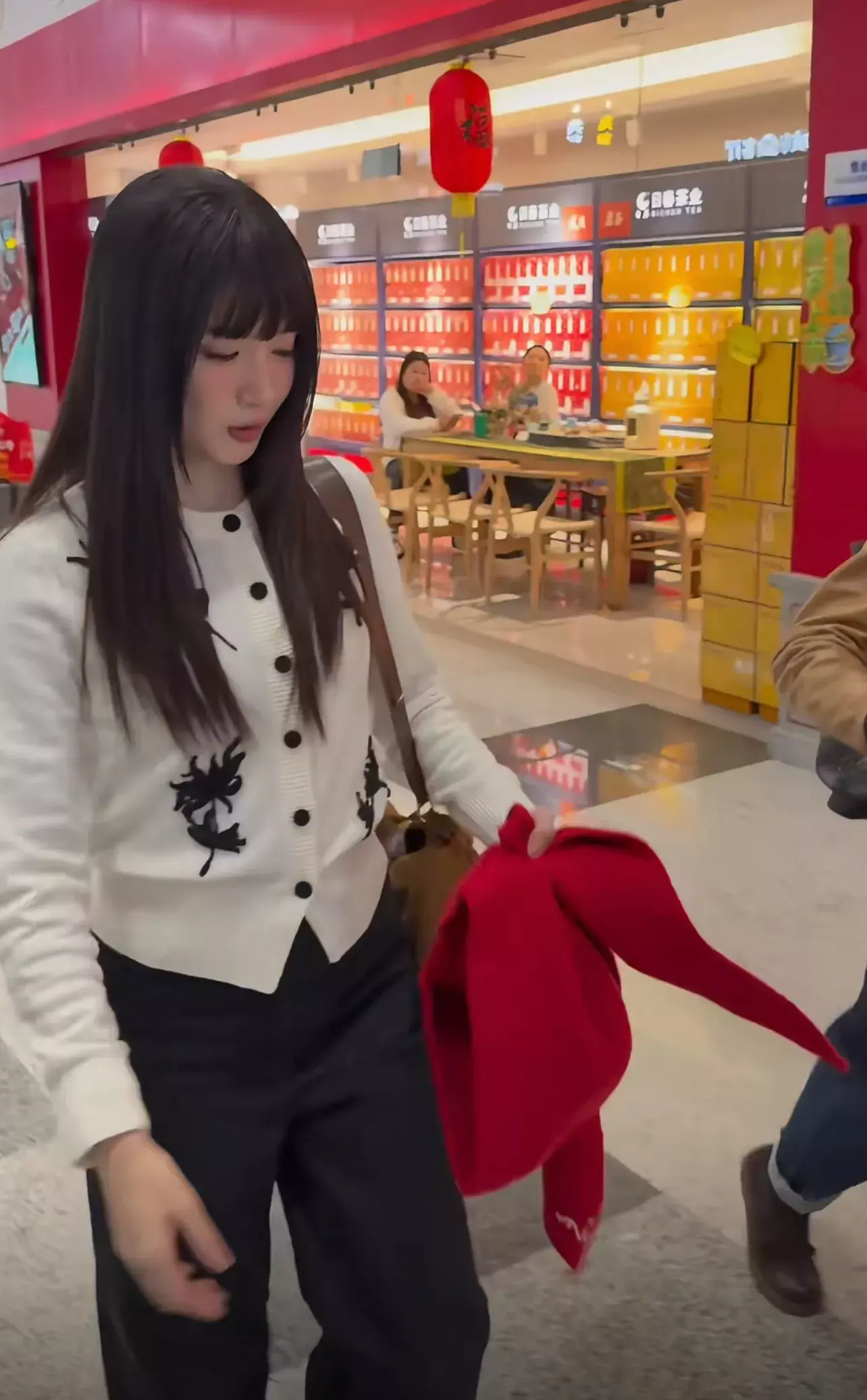 除了黑色套装,米白色搭配红色,更显喜庆!不知道是不是圣诞节快来的原因,江疏影最近带着红色毛线帽出现在机场!